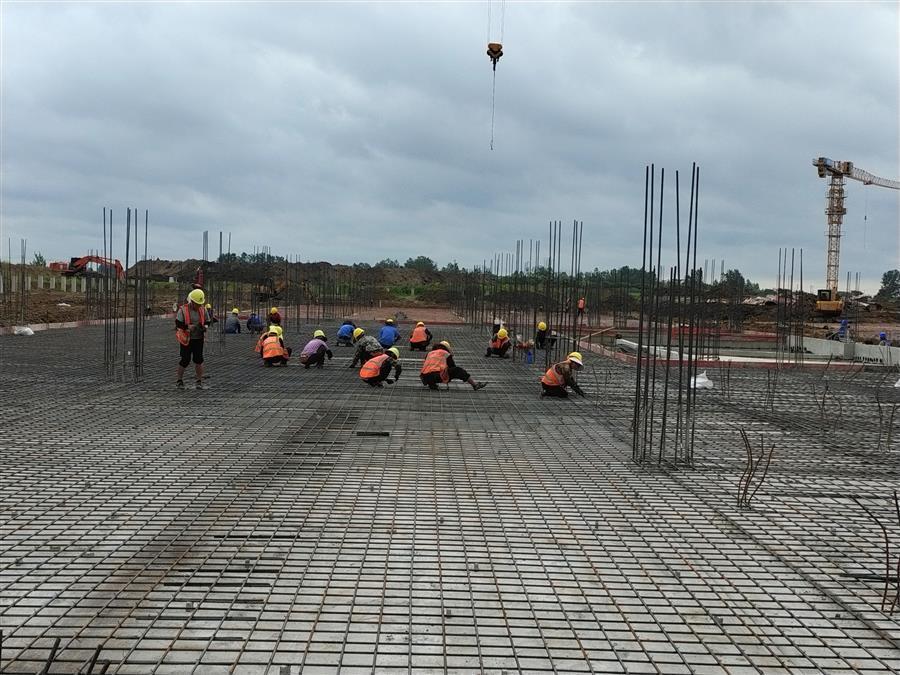 “日均投入施工技術(shù)人員500余人、各類機(jī)械設(shè)備45臺(tái)搶抓施工節(jié)點(diǎn)。”項(xiàng)目負(fù)責(zé)人禤旭云說,自6月開工以來,針對(duì)項(xiàng)目工期緊、任務(wù)重的情況,項(xiàng)目部按照“開工即攻堅(jiān)、起步即沖刺”的要求,全面推進(jìn)項(xiàng)目建設(shè)。目前,中試車間基礎(chǔ)回填、褥墊層鋪筑、墊層澆筑、剛性地面鋼筋綁扎完成;1#生產(chǎn)車間53~56軸獨(dú)基開挖基礎(chǔ)承臺(tái)鋼筋綁扎、模板安裝、砼澆筑完成,48~52軸基礎(chǔ)開挖、墊層澆筑完成;2#生產(chǎn)車間18~25軸基礎(chǔ)承臺(tái)鋼筋綁扎、模板安裝、砼澆筑完成;倉(cāng)庫(kù)基礎(chǔ)梁全部完成。