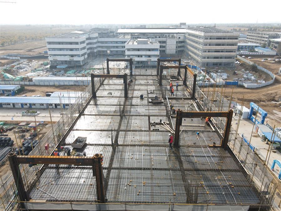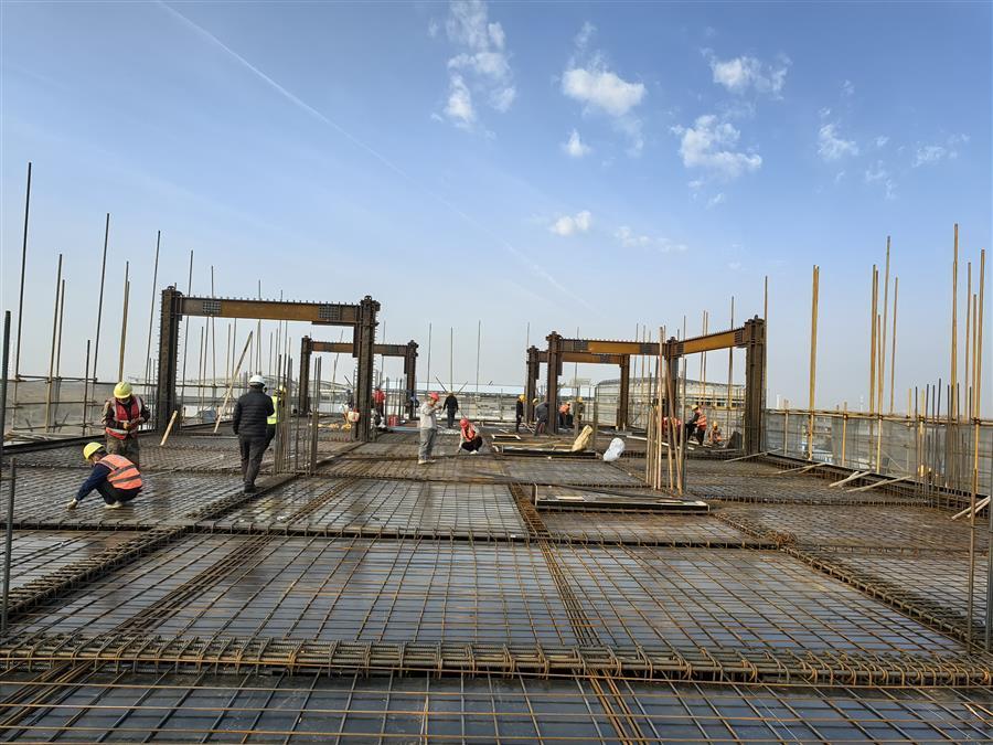 在施工現(xiàn)場,到處可見建筑工人們忙碌的身影,大家分工合作,井然有序地進(jìn)行病房北樓梁板鋼筋綁扎、水電消防線管預(yù)埋、鋼結(jié)構(gòu)吊裝、醫(yī)技區(qū)東段盤扣架搭設(shè)、汽車坡道混凝土澆筑等工作面施工,各作業(yè)面協(xié)同推進(jìn),現(xiàn)場掀起“大干”熱潮。
