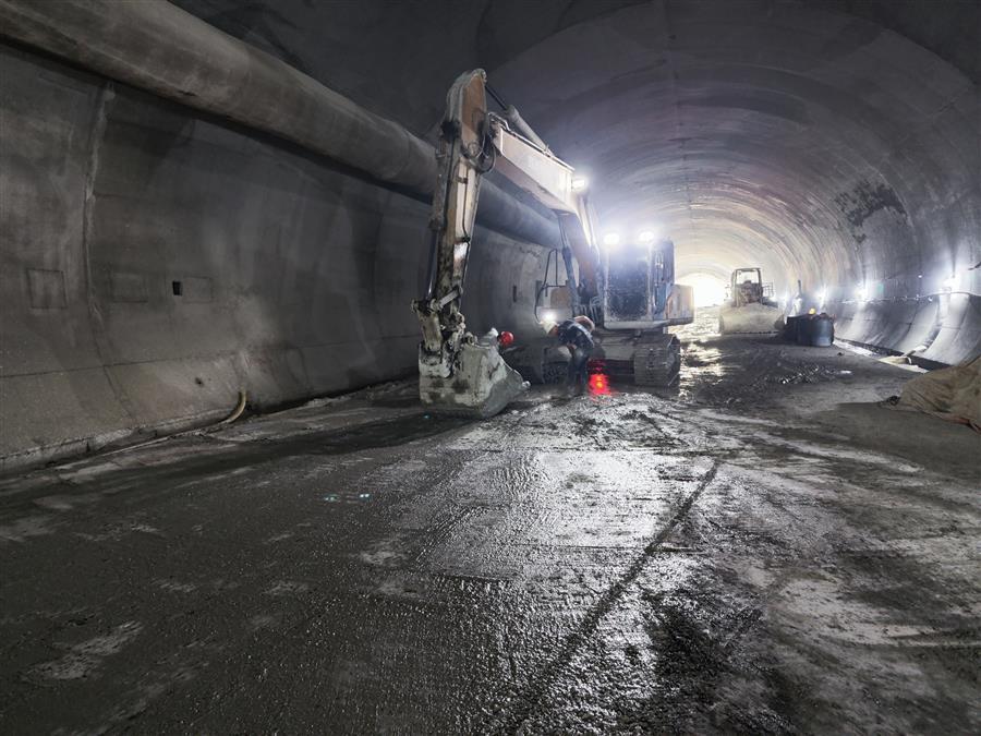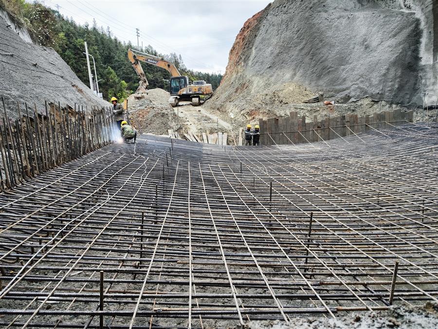 在施工現(xiàn)場,機器轟鳴,挖掘機正在對隧道明洞部分的土方進行開挖,出渣車有序作業(yè)外運渣土;工人們正有條不紊地焊接、搭建地連墻鋼筋籠;在隧道深處,一臺挖掘機在操作人員的操控下,正揮動著“手臂”,配合著工人在對隧道路面做清理?!盀榧涌祉椖渴┕みM度,我們采取人員倒班、設(shè)備不停,白天晚上不間斷施工?!表椖拷?jīng)理介紹說,目前隧道工程已全面貫通,爭取在春節(jié)前完成仰拱和墻供二襯砼澆筑。