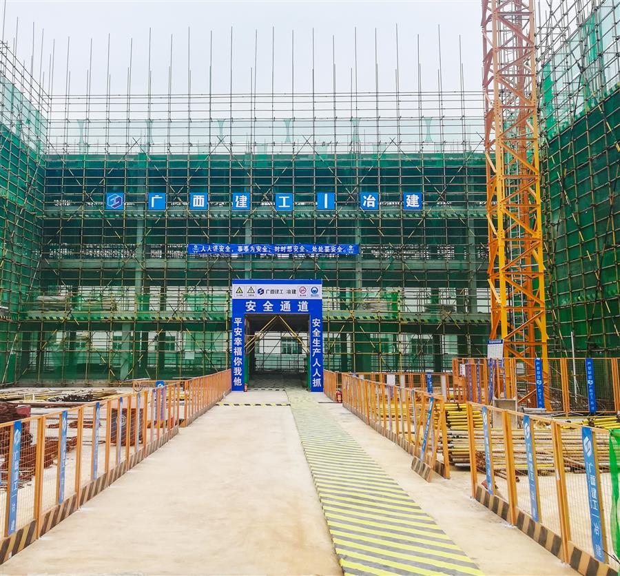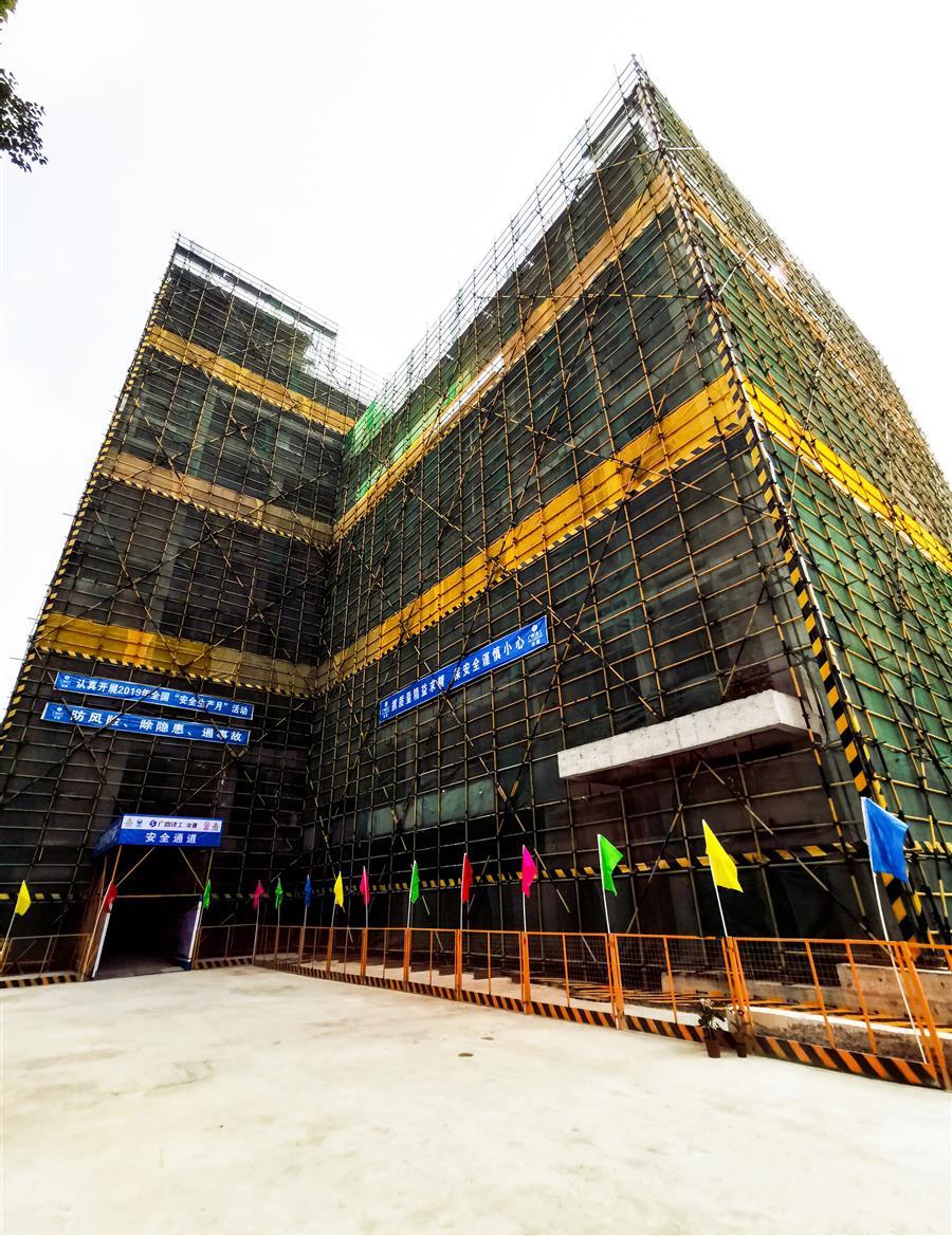 該項目由桂金分公司承建,總建筑面積14993.85平方米,包括1棟9層40.35米高的業(yè)務綜合樓和1層10.8米高的報告廳,以及大門、圍墻、供配電、給排水、道路及地面硬化、擋土墻、綠化、醫(yī)療氣體系統(tǒng)等附屬設(shè)施及電梯等設(shè)備購置。目前,項目已完成整體地下室及主樓1~5主體框架結(jié)構(gòu)施工,目前正在進行主樓6層內(nèi)架搭設(shè)。