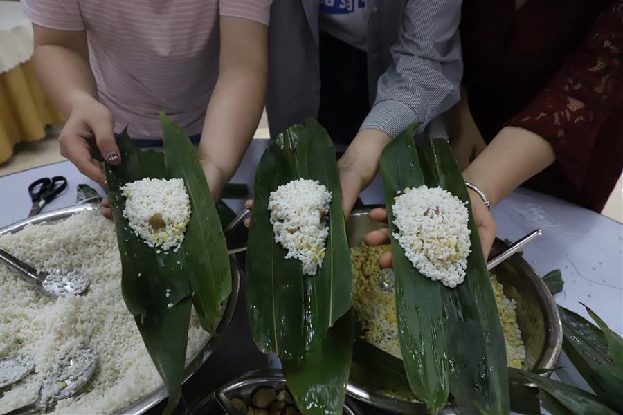 經(jīng)過簡單的現(xiàn)場教學后,大家領取材料,分組配合,踴躍參與包粽子比賽,只見大家捋粽葉、放餡、封口、扎捆,動作一氣呵成,不一會兒,一只只各式各樣的粽子就在大家手中成型。