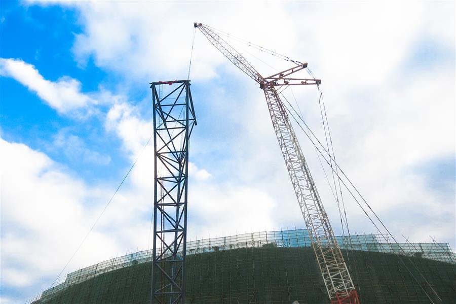 靖西市乒乓主題體育公園鋼結構罩棚空間桁架采用三角桁架形式,桁架柱向外傾斜,與地面夾角呈65°,重量達25噸,桁架柱即徑向桁架為三角管桁架,整體結構呈倒L形,根據其受力特點可分為懸挑式和前端支承式,懸挑式根部設置撐桿,撐桿連接在看臺勁性柱上。此次桁架吊裝難度大、技術要求高,項目部從構件進場、精準定位、吊裝,每一道工序、每一個環(huán)節(jié)都實行全過程無縫隙標準化管理,全力確保安裝和細節(jié)符合技術要求。