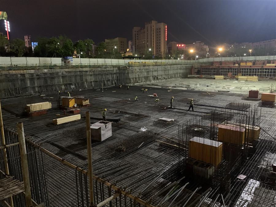 時至深夜,贛州市人民醫(yī)院新院職工交流房項目工作人員依舊奮戰(zhàn)在施工現(xiàn)場,現(xiàn)場機械轟鳴聲、焊接切割聲交織在一起,一片熱火朝天的大干景象。目前,130余名施工作業(yè)人員全面鋪開各個工作面,底板防水施工、承臺鋼筋綁扎、磚胎膜砌筑、樁頭破除、地下室頂板架子搭設和模板安裝等工作都在有序推進,各班組都在按照計劃加班加點推進項目建設進度。