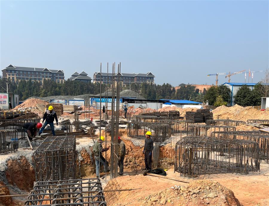 融水苗族自治縣安陲鄉(xiāng)江門村鄉(xiāng)村振興產(chǎn)業(yè)園項目總建筑面積約8420平方米。項目建設內(nèi)容包括:園區(qū)標準廠房建設及道路工程、場地平整、雨水、污水、給水、室外電氣及室外綠化工程;廠房結(jié)構(gòu)形式為框架結(jié)構(gòu)。目前,項目1#廠房二層磚墻砌磚40%;4#、5#廠房外墻磚砌筑90%;7#廠房主體結(jié)構(gòu)屋面鋼筋綁扎完成。