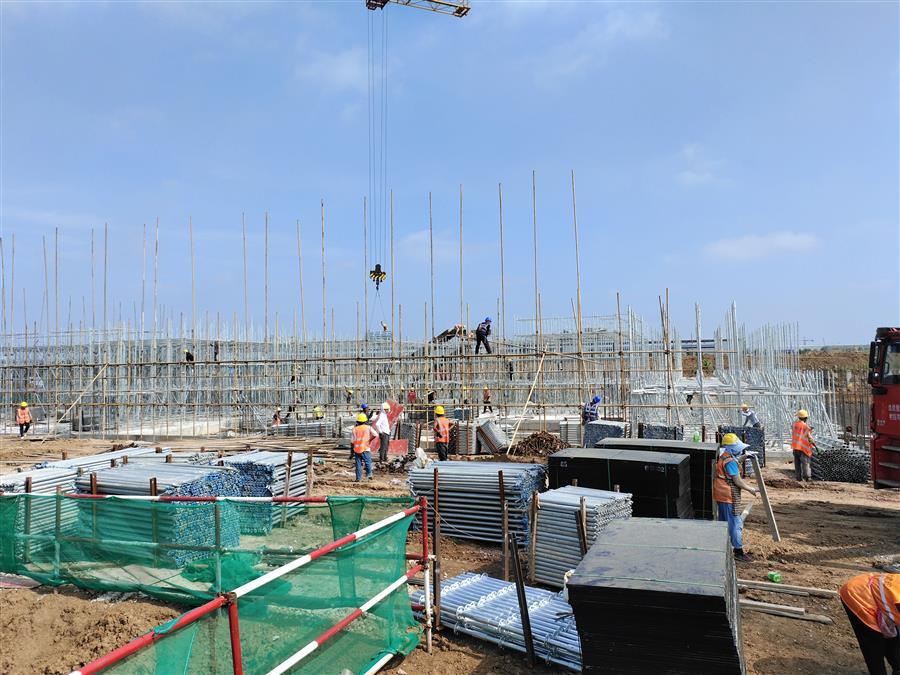 “日均投入施工技術(shù)人員500余人、各類機(jī)械設(shè)備45臺(tái)搶抓施工節(jié)點(diǎn)。”項(xiàng)目負(fù)責(zé)人禤旭云說,自6月開工以來,針對(duì)項(xiàng)目工期緊、任務(wù)重的情況,項(xiàng)目部按照“開工即攻堅(jiān)、起步即沖刺”的要求,全面推進(jìn)項(xiàng)目建設(shè)。目前,中試車間基礎(chǔ)回填、褥墊層鋪筑、墊層澆筑、剛性地面鋼筋綁扎完成;1#生產(chǎn)車間53~56軸獨(dú)基開挖基礎(chǔ)承臺(tái)鋼筋綁扎、模板安裝、砼澆筑完成,48~52軸基礎(chǔ)開挖、墊層澆筑完成;2#生產(chǎn)車間18~25軸基礎(chǔ)承臺(tái)鋼筋綁扎、模板安裝、砼澆筑完成;倉(cāng)庫(kù)基礎(chǔ)梁全部完成。