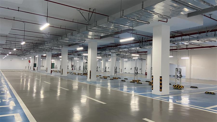 項(xiàng)目總建筑面積約2.7萬平方米,為一座兩層局部覆土式地上停車庫,建設(shè)內(nèi)容包含停車場、地面廣場鋪裝及綠化、給排水、電氣、消防等附屬工程。項(xiàng)目建成將新增600個(gè)機(jī)動(dòng)車位,其中負(fù)二層510個(gè)機(jī)動(dòng)車位,負(fù)一層78個(gè)有充電樁的新能源停車位,屋面12個(gè)無障礙車位;另外,停車庫屋面設(shè)有283個(gè)非機(jī)動(dòng)車位。綠地率為60%。停車場內(nèi)部空間寬敞明亮,外觀看像是地下停車庫,但實(shí)際上由于該區(qū)域地勢較低,為合理規(guī)劃,特意將停車庫設(shè)計(jì)為地上兩層局部覆土式停車庫,即在停車庫上方回填泥土,在泥土上種植綠化樹木,將車庫上方裝點(diǎn)成一個(gè)小公園。項(xiàng)目交付運(yùn)營,有效緩解三門江森林公園周邊“停車難”問題。