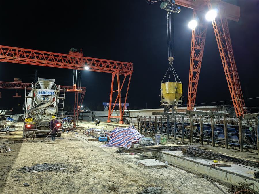 在施工現(xiàn)場,20多臺(tái)大型設(shè)備在不同時(shí)段連續(xù)配合作業(yè),運(yùn)輸車輛有序進(jìn)行運(yùn)土填筑路基、材料進(jìn)出場,100多名項(xiàng)目管理人員及工人分為預(yù)制梁場、樁基施工、橋梁下部結(jié)構(gòu)等班組全線鋪開,在各個(gè)作業(yè)點(diǎn)上有條不紊地開展施工作業(yè)。