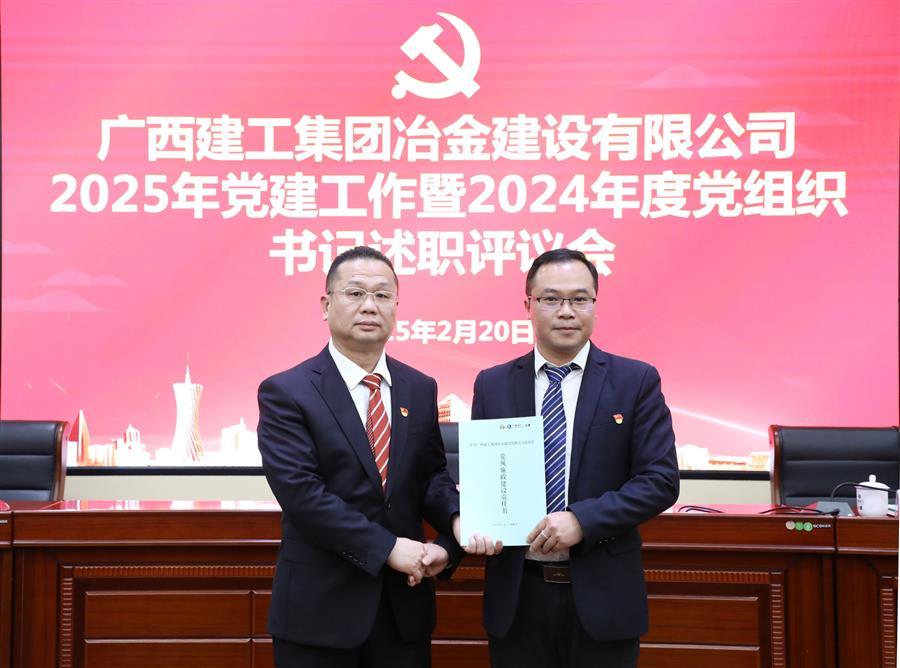 2月20日,冶建公司2025年黨建工作暨2024年度黨組織書記述職評議會議在公司1號樓第二會議室召開。公司黨委書記、董事長覃振華參加并講話,黨委副書記、總經理蒙勝益參加,黨委副書記、紀委書記、工會主席賴海標主持。