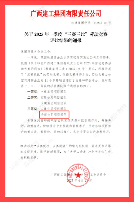 4月23日,集團公司工會通報2025年一季度“三賽三比”勞動競賽評比結果,冶建公司項目團隊在11個建安企業(yè)參賽項目中榮獲三等獎,彰顯了項目團隊務實高效、團結協(xié)作、拼搏進取的精神風貌。