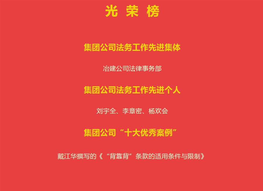 這些榮譽的取得,是全體法務(wù)人員辛勤努力的結(jié)果,更是公司整體實力的體現(xiàn)。冶建公司法律事務(wù)部將繼續(xù)為公司平穩(wěn)發(fā)展拼搏奮進,努力為公司實現(xiàn)恢復性增長作出新的貢獻!